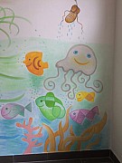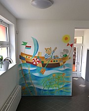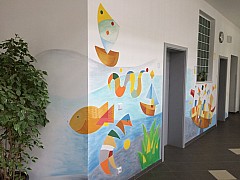 Vodní svět II - monumentální malba na zdech chodby přízemí a 1. patra MŠ Nad Vodovodem, Praha 10 - Strašnice,